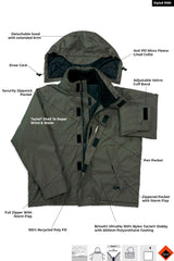 - Removable hood with extended brim, drawcord & cord locks tuck into hood storage pouch in the lining.