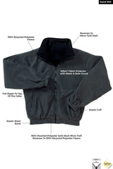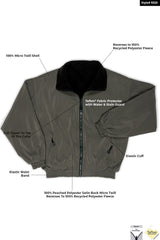- Zip pockets on the peached polyester side, welt pockets on recycled polyester fleece side.