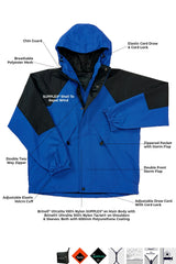 - Hood with elastic drawcords and cord locks, chin guard, double zipper and snap closure on double front storm flap for extra protection.
